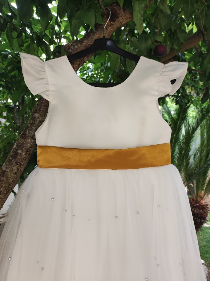 Confeccionado em cetim e tule, proporciona um volume delicado e confortável. O corpete liso, com mangas ruffle e decote profundo nas costas, garante elegância sem deixar de lado o bem-estar da criança.