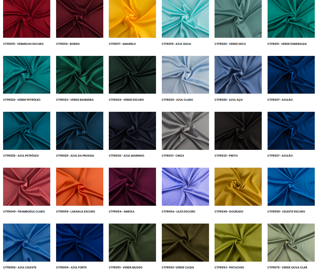 Branco ,Amarelo ,Ameixa ,Azul Aço ,Azul Água ,Azul Celeste ,Azul Celeste Escuro ,Azul Claro ,Azul da Prússia ,Azul Forte ,Azul Marinho ,Azul Petróleo ,Azulão ,Beje Claro ,Blush ,Blush Rosado ,Bordô ,Camel ,Castanho ,Castanho Clarinho ,Champanhe ,Pérola ,Cinza ,Cinza Médio ,Coral ,Dourado ,Ferrugem ,Framboesa ,Framboesa Claro ,Fúcsia ,Laranja Escuro ,Lilás ,Lilás Escuro ,Lilás Escuro ,Malva ,Nude ,Nude Rosado ,Orquídea ,Preto ,Rosa Claro ,Rosa Escuro ,Rosa Médio ,Rosa Velho Escuro ,Roxo ,Salmão ,Toupeira Claro ,Verde Bandeira ,Verde Caqui ,Verde Chá ,Verde Escuro ,Verde Esmeralda ,Verde Musgo ,Verde Pistachio Escuro ,Verde Seco ,Vermelho ,Vermelho Escuro ,Violeta Clarinho ,Violeta Ecuro |