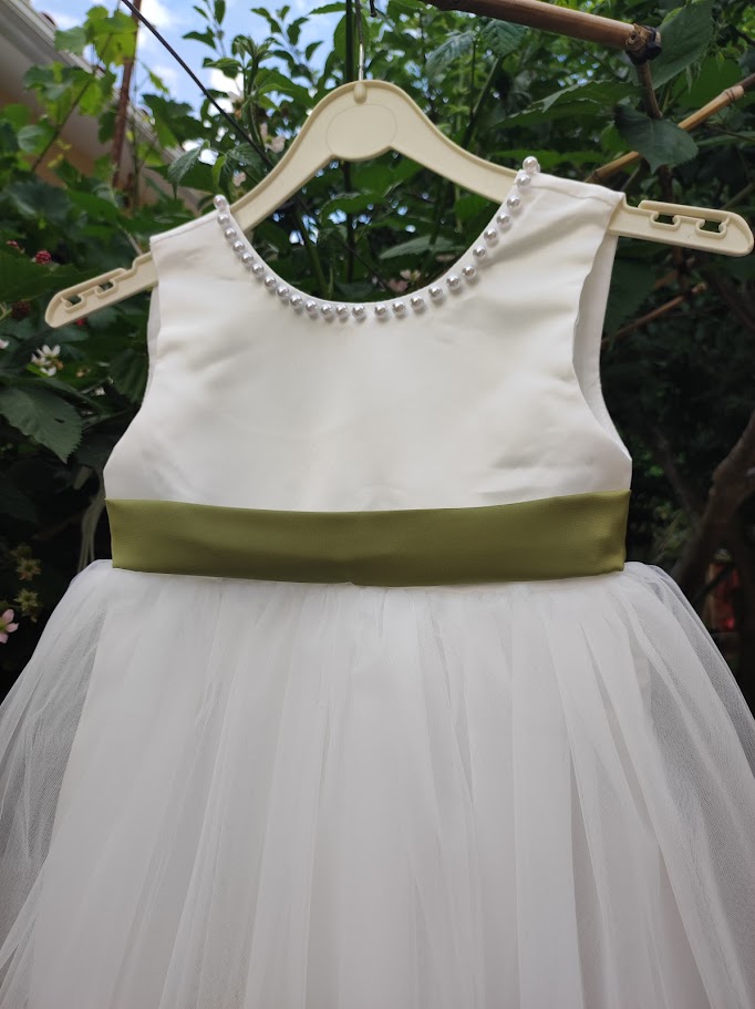 Feito em cetim na parte superior, tule na parte inferior, pérolas no decote da frente e de trás e laço e cinto em cetim com pérolas na zona central.