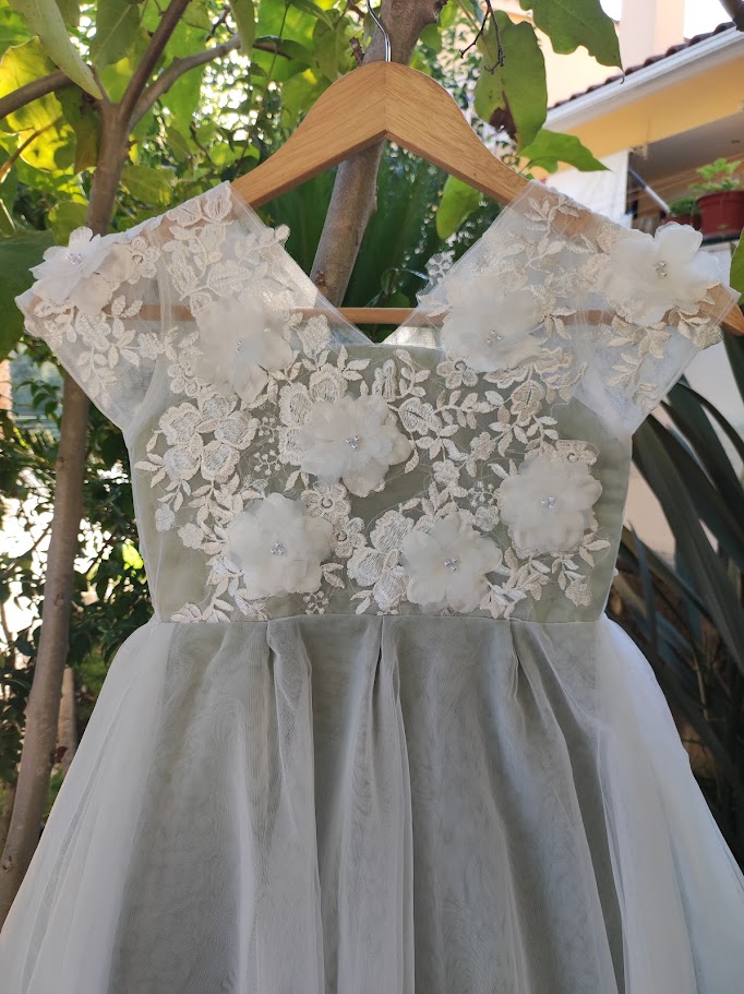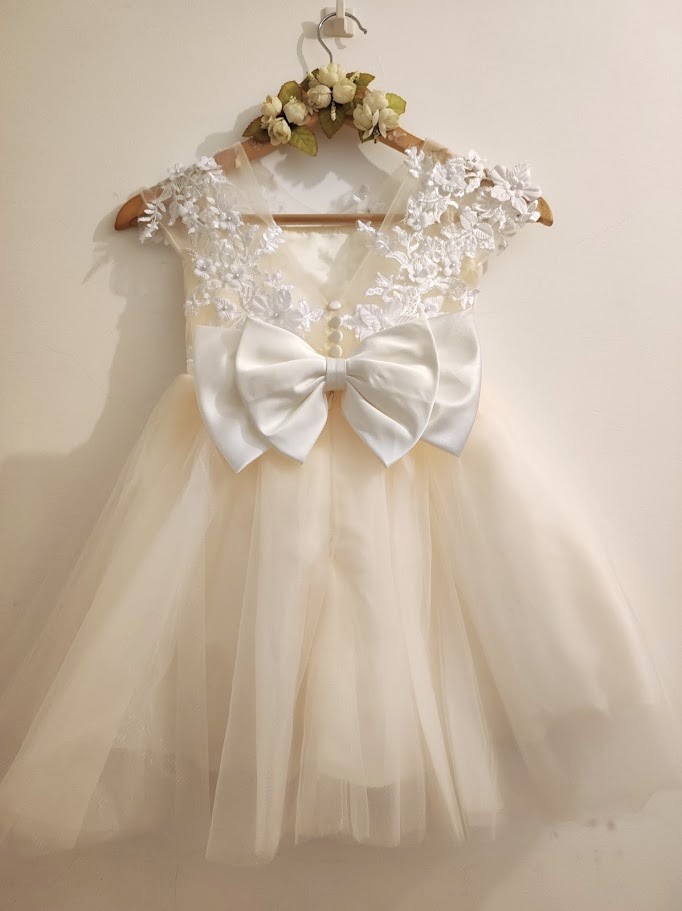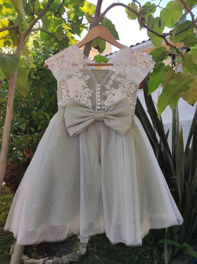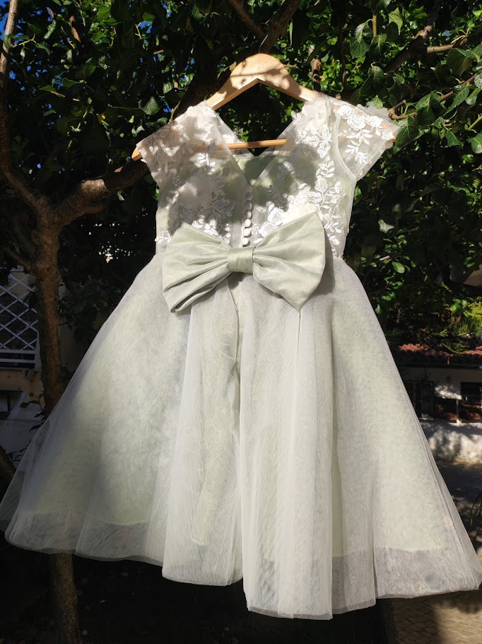 Confeccionado em tule e renda, proporciona um volume delicado e confortável. O corpete rendado, com manga curta e decote em V nas costas com pérolas, garante a sofisticação garantindo o conforto da criança.